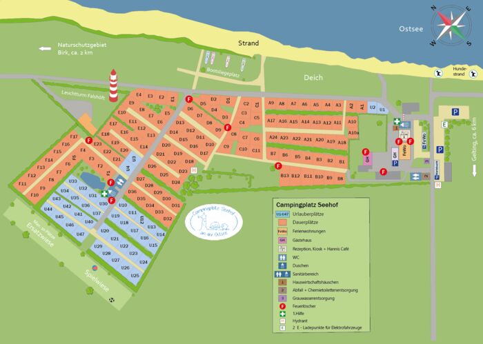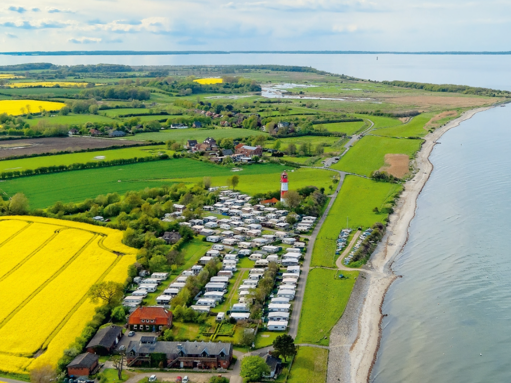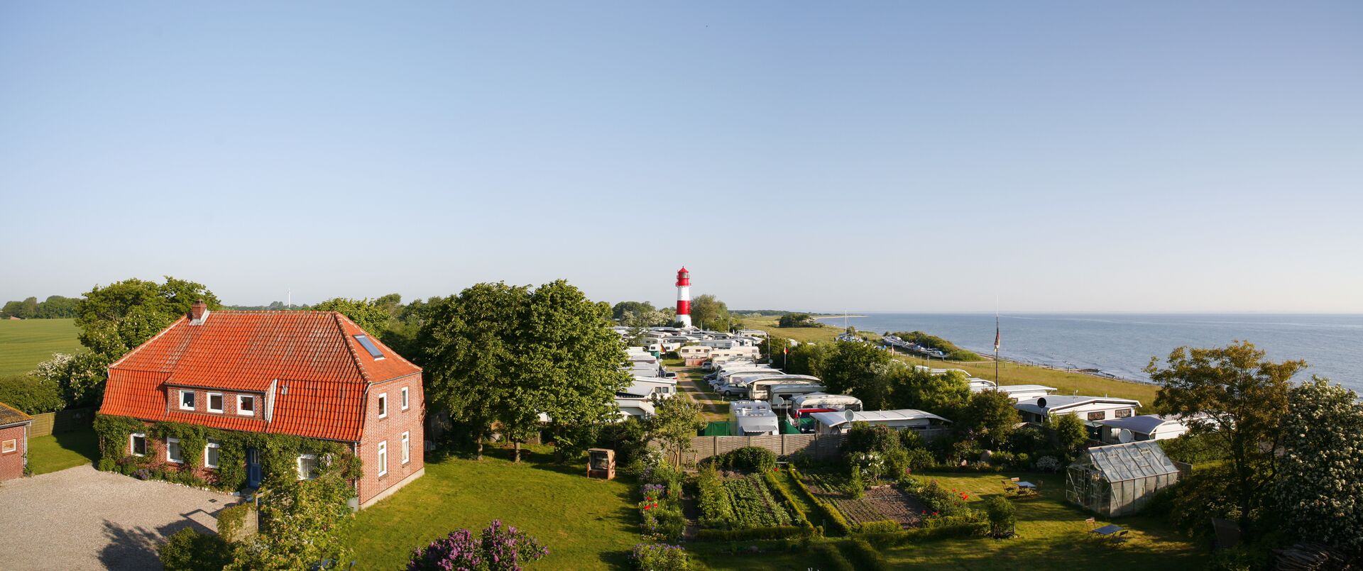 Am Fuße des Falshöfter Leuchtturms liegen unsere einhundert Quadratmeter großen Stellplätze auf einem durch Buschreihen aufgelockerten, naturbelassenen Wiesengelände. Von den Urlauberplätzen im hinteren und geschützteren Bereich unseres Platzes ist man in wenigen Gehminuten am schönen Naturstrand.